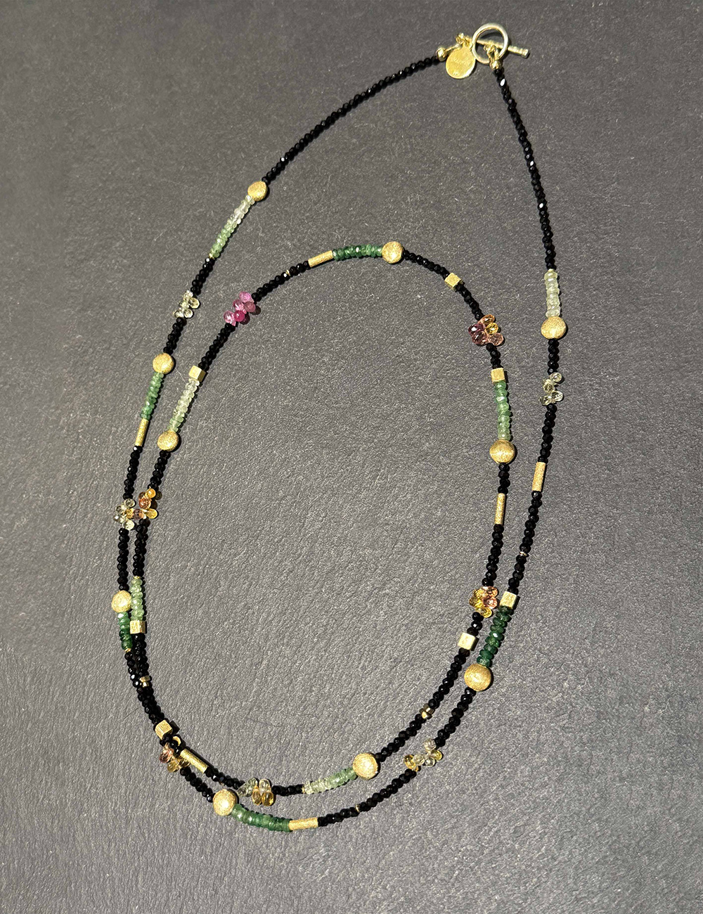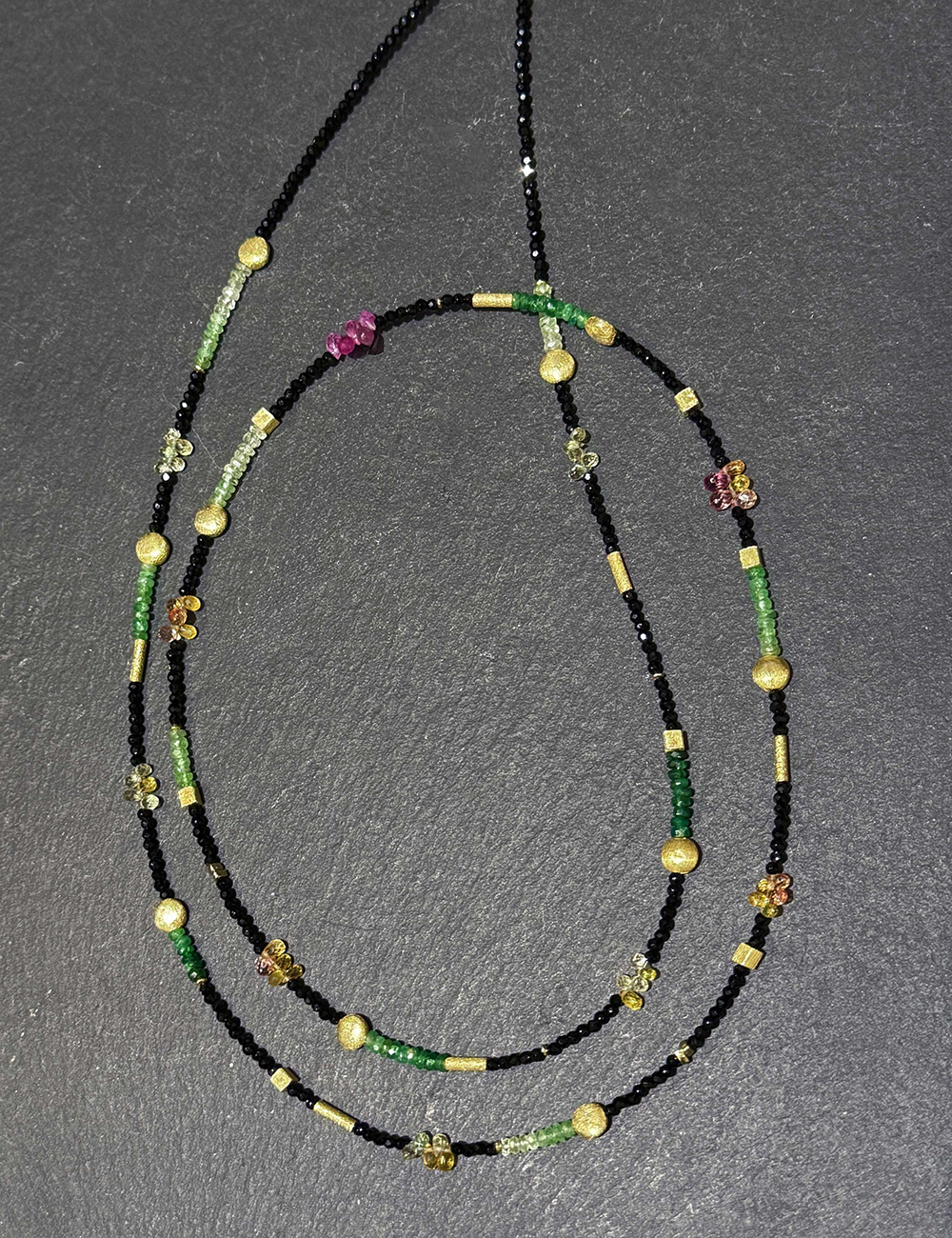 A refined long necklace handcrafted with natural gemstones. Black spinel beads form an elegant base, accented with emerald and multicolored sapphire for subtle, vibrant highlights. Matte gold-plated silver details add warmth and structure to the design. Lightweight and versatile, it can be worn alone or layered to create a modern, effortless look. Materials Emerald · Sapphire · Black Spinel Gold-plated Silver