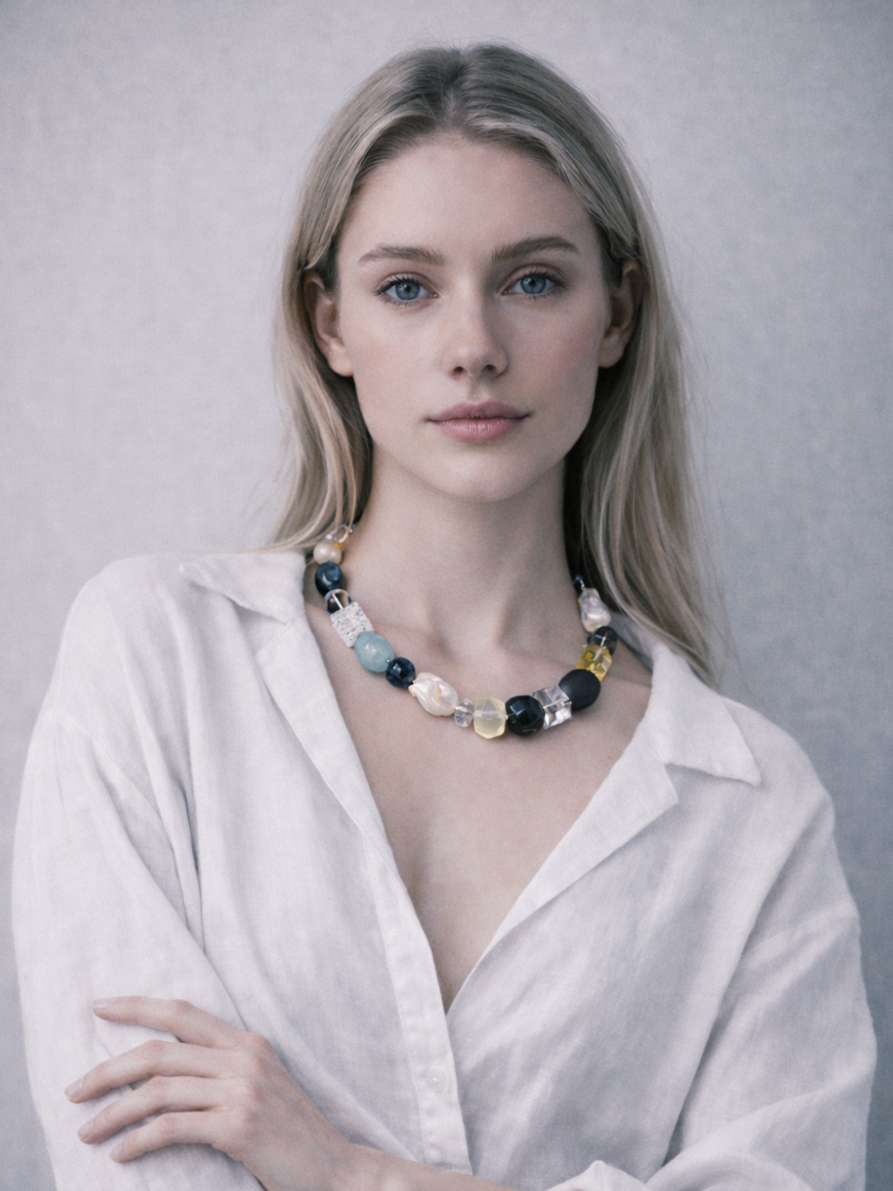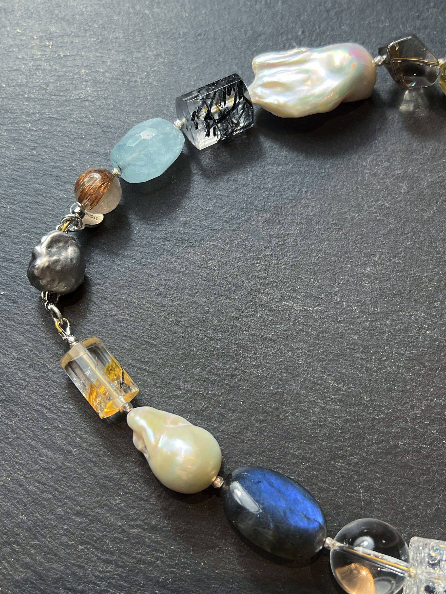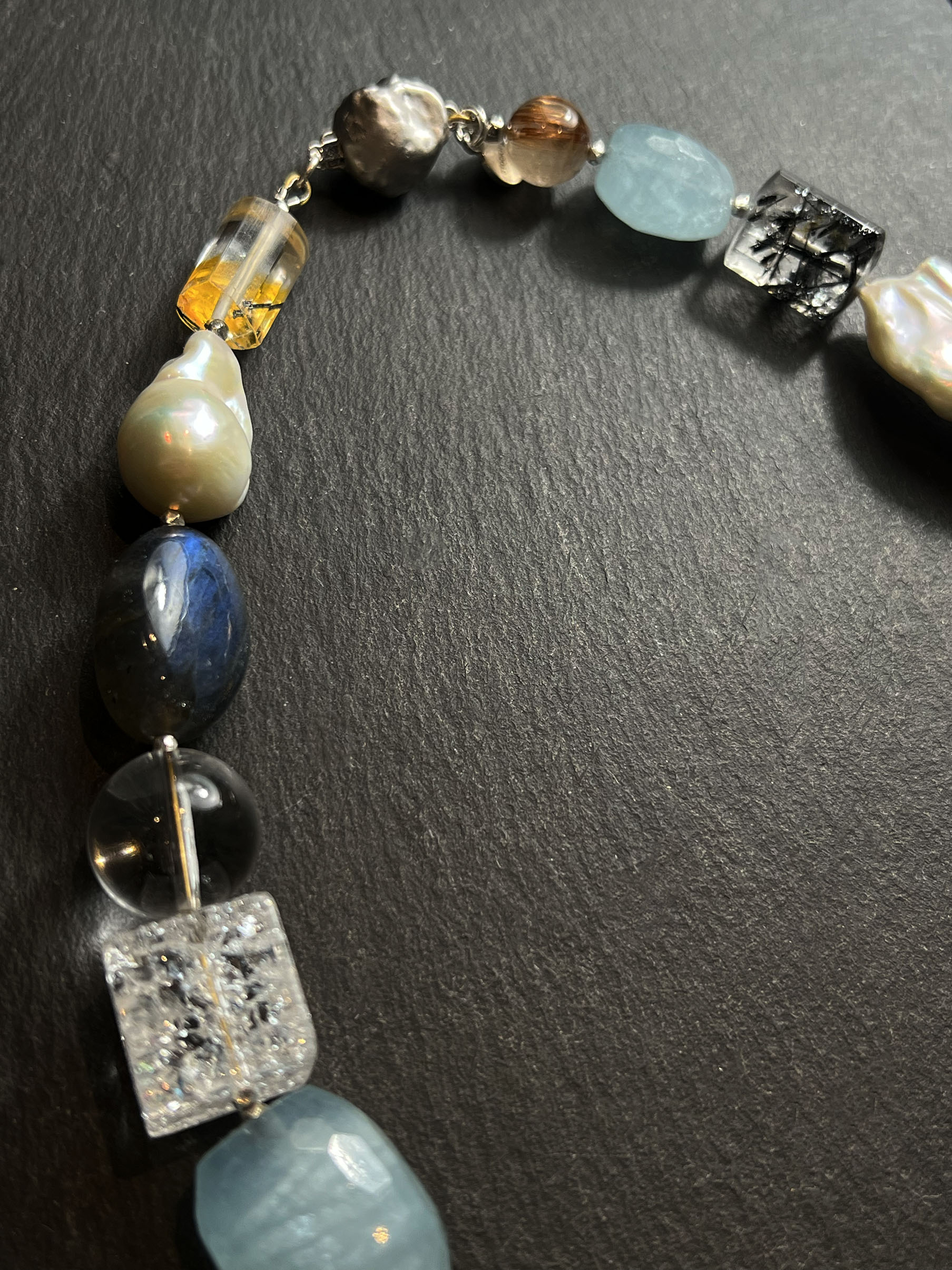 This necklace is composed of carefully selected natural gemstones and pearls of various shapes: aquamarine, rutilated quartz, baroque pearl, smoky quartz, citrine, cherry amber, kyanite, crystal, tourmaline Quartz, and rutilated quartz. Each chosen for its unique texture and character. Soft blues, warm ivory, deep blacks, and translucent yellows interplay, echoing the subtle changes in the Nordic seasons' light. The design abandons symmetry in favor of irregularity, creating a serene yet expressive balance. Each necklace is meticulously crafted by artisans, making them unique—no two pieces are exactly alike. Wearing it is like carrying a small, precious fragment of nature with you. This timeless classic transcends trends, designed for those who appreciate understated elegance and natural beauty.