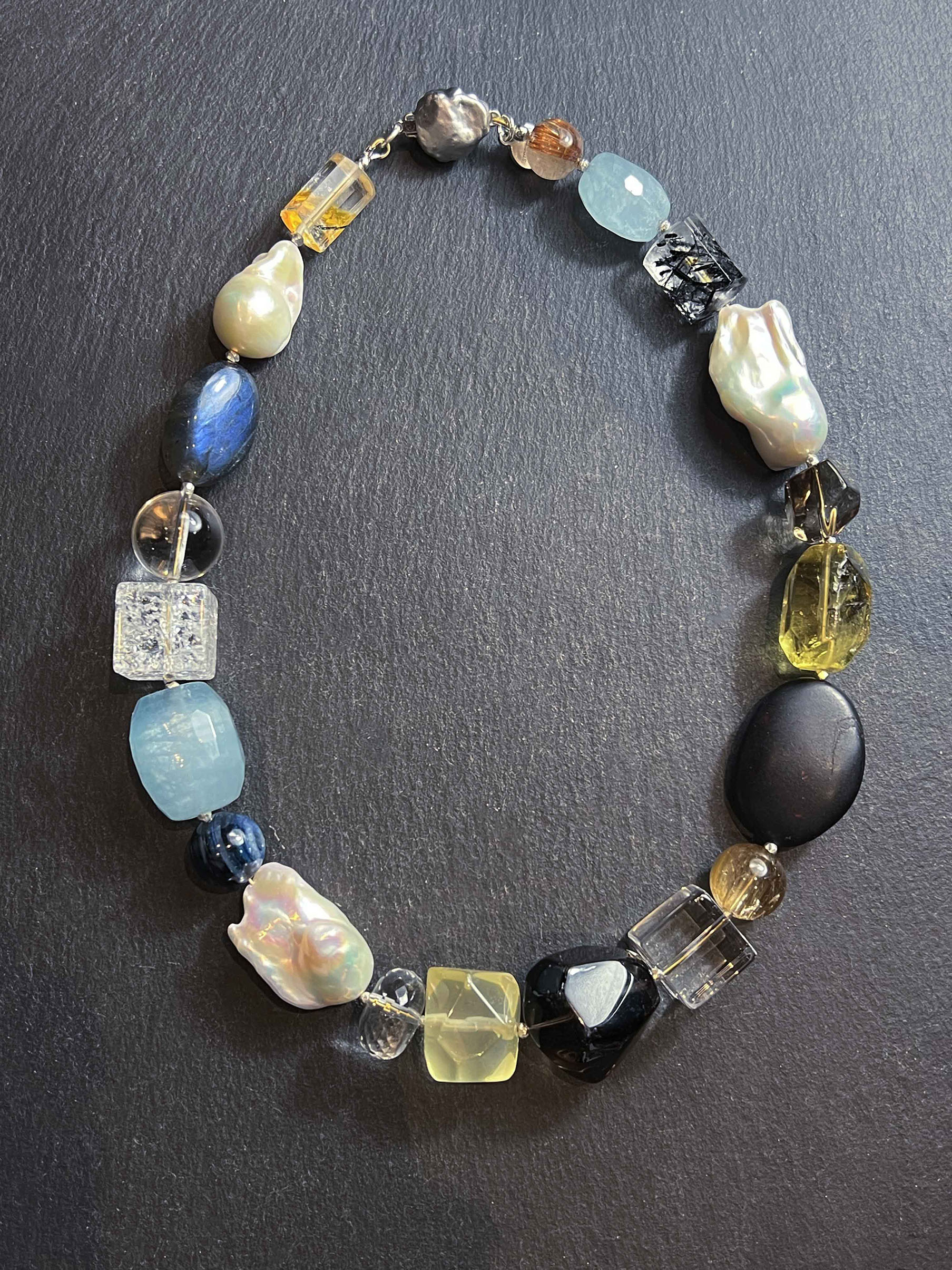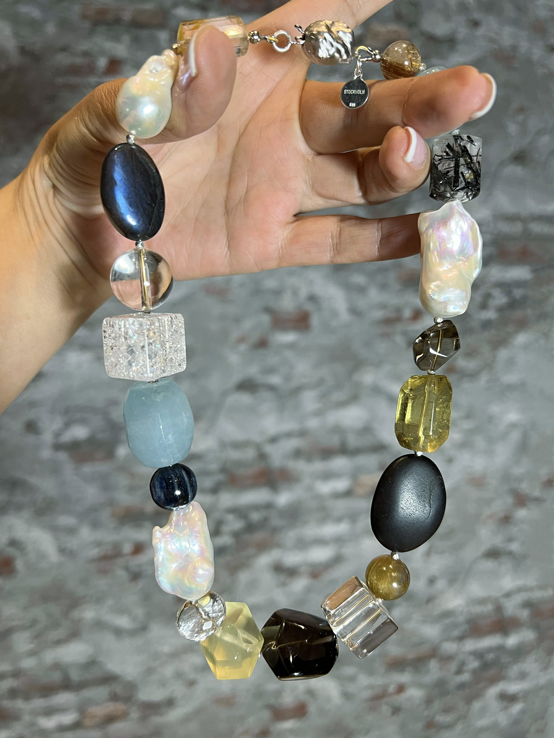 This necklace is composed of carefully selected natural gemstones and pearls of various shapes: aquamarine, rutilated quartz, baroque pearl, smoky quartz, citrine, cherry amber, kyanite, crystal, tourmaline Quartz, and rutilated quartz. Each chosen for its unique texture and character. Soft blues, warm ivory, deep blacks, and translucent yellows interplay, echoing the subtle changes in the Nordic seasons' light. The design abandons symmetry in favor of irregularity, creating a serene yet expressive balance. Each necklace is meticulously crafted by artisans, making them unique—no two pieces are exactly alike. Wearing it is like carrying a small, precious fragment of nature with you. This timeless classic transcends trends, designed for those who appreciate understated elegance and natural beauty.